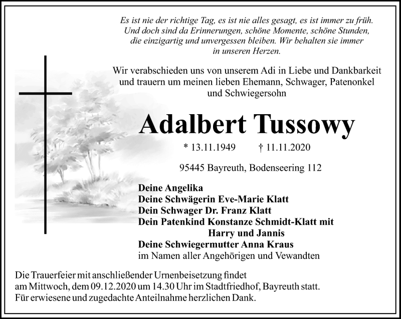 Hier finden Sie alle Traueranzeigen aus der Zeitung, die bisher für Adalbert Tussowy erschienen sind. Weitere Traueranzeigen, die in der Zeitung erscheinen, werden hier ebenfalls aufgelistet