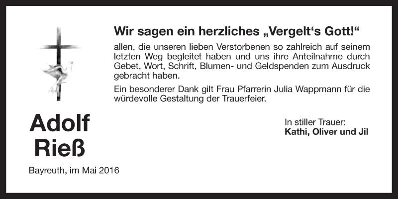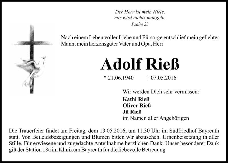 Hier finden Sie alle Traueranzeigen aus der Zeitung, die bisher für Adolf Rieß erschienen sind. Weitere Traueranzeigen, die in der Zeitung erscheinen, werden hier ebenfalls aufgelistet