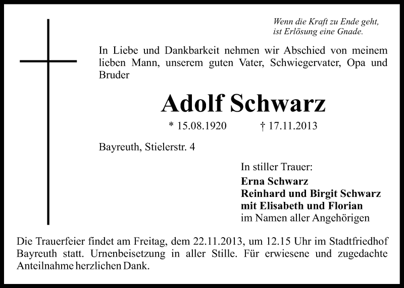 Hier finden Sie alle Traueranzeigen aus der Zeitung, die bisher für Adolf Schwarz erschienen sind. Weitere Traueranzeigen, die in der Zeitung erscheinen, werden hier ebenfalls aufgelistet
