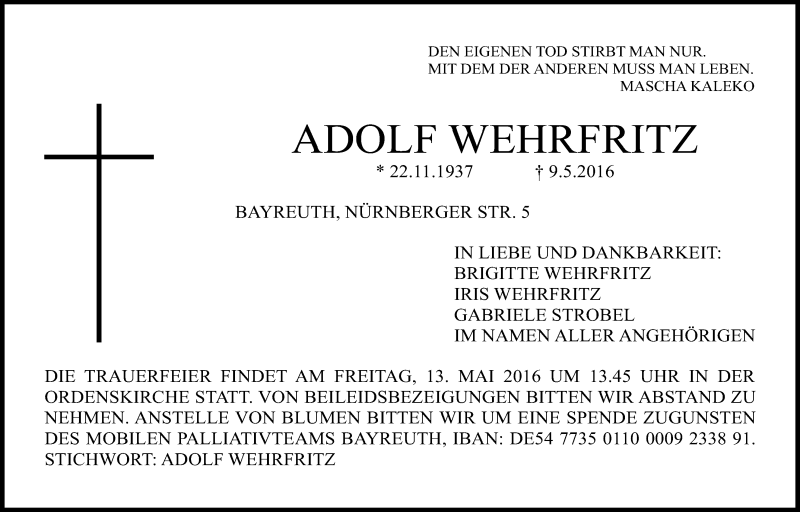 Hier finden Sie alle Traueranzeigen aus der Zeitung, die bisher für Adolf Wehrfritz erschienen sind. Weitere Traueranzeigen, die in der Zeitung erscheinen, werden hier ebenfalls aufgelistet