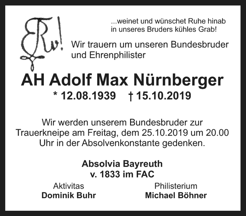Hier finden Sie alle Traueranzeigen aus der Zeitung, die bisher für Adolf Max Nürnberger erschienen sind. Weitere Traueranzeigen, die in der Zeitung erscheinen, werden hier ebenfalls aufgelistet