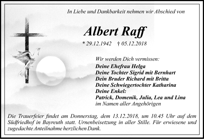 Hier finden Sie alle Traueranzeigen aus der Zeitung, die bisher für Albert Raff erschienen sind. Weitere Traueranzeigen, die in der Zeitung erscheinen, werden hier ebenfalls aufgelistet