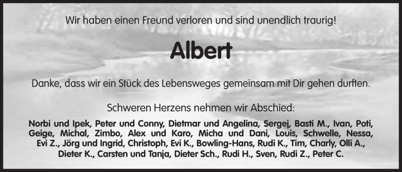 Hier finden Sie alle Traueranzeigen aus der Zeitung, die bisher für Albert Weiß erschienen sind. Weitere Traueranzeigen, die in der Zeitung erscheinen, werden hier ebenfalls aufgelistet
