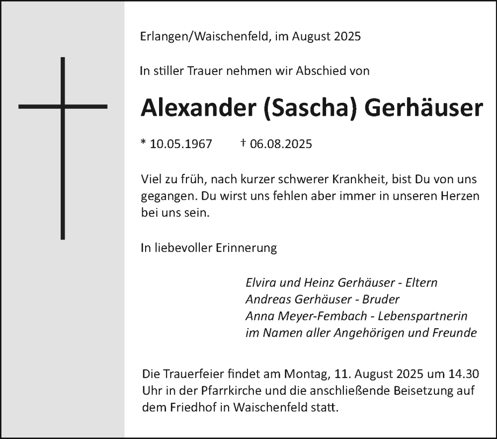 Hier finden Sie alle Traueranzeigen aus der Zeitung, die bisher für Alexander Gerhäuser erschienen sind. Weitere Traueranzeigen, die in der Zeitung erscheinen, werden hier ebenfalls aufgelistet