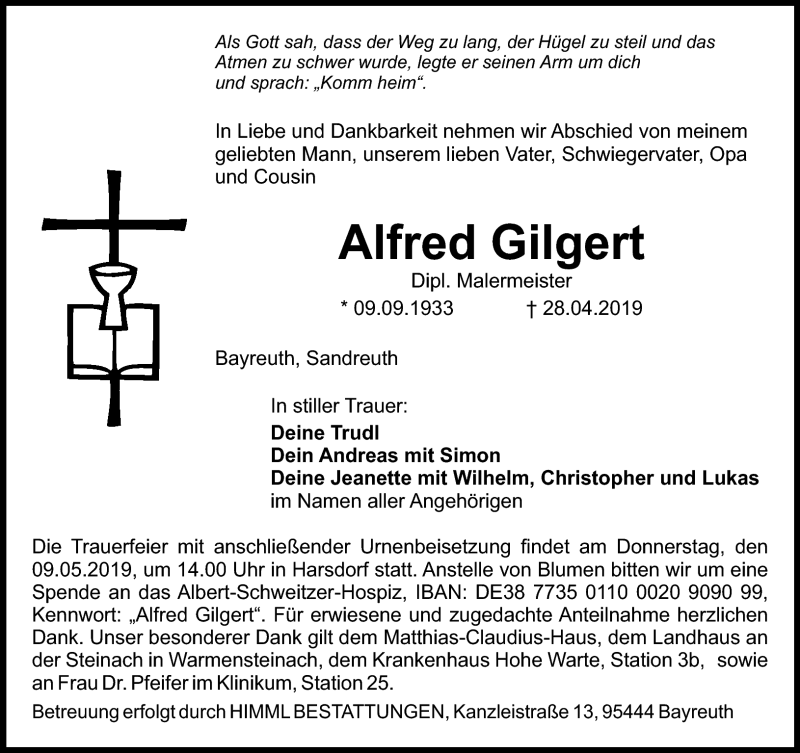 Hier finden Sie alle Traueranzeigen aus der Zeitung, die bisher für Alfred Gilgert erschienen sind. Weitere Traueranzeigen, die in der Zeitung erscheinen, werden hier ebenfalls aufgelistet