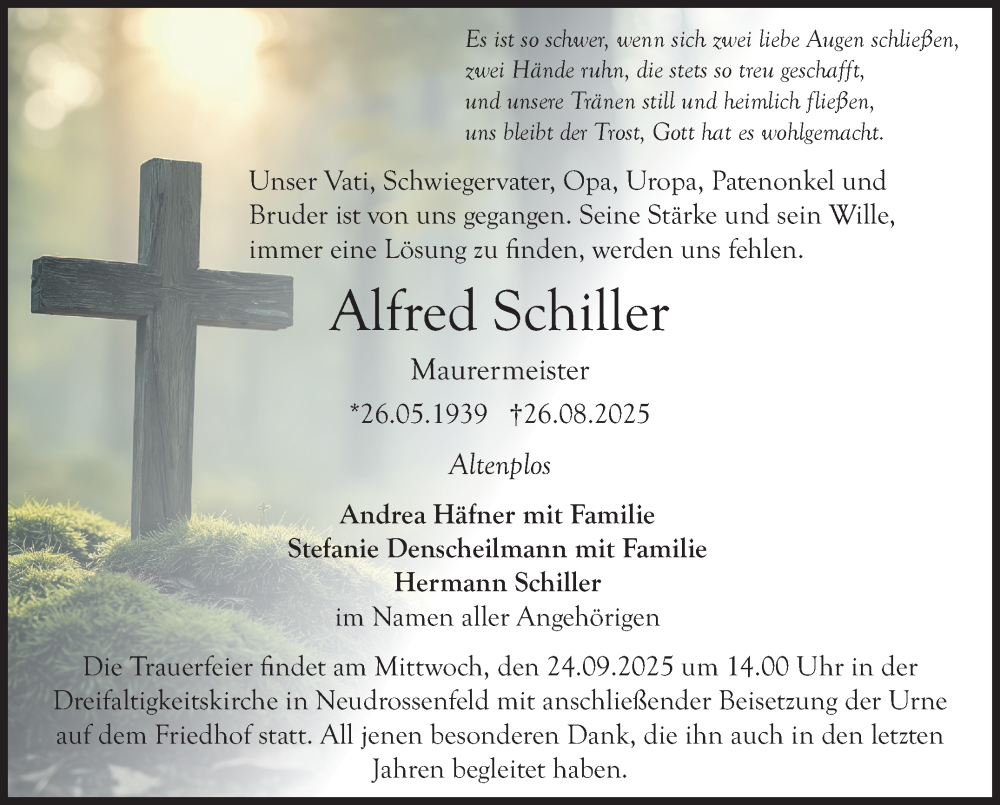 Hier finden Sie alle Traueranzeigen aus der Zeitung, die bisher für Alfred Schiller erschienen sind. Weitere Traueranzeigen, die in der Zeitung erscheinen, werden hier ebenfalls aufgelistet