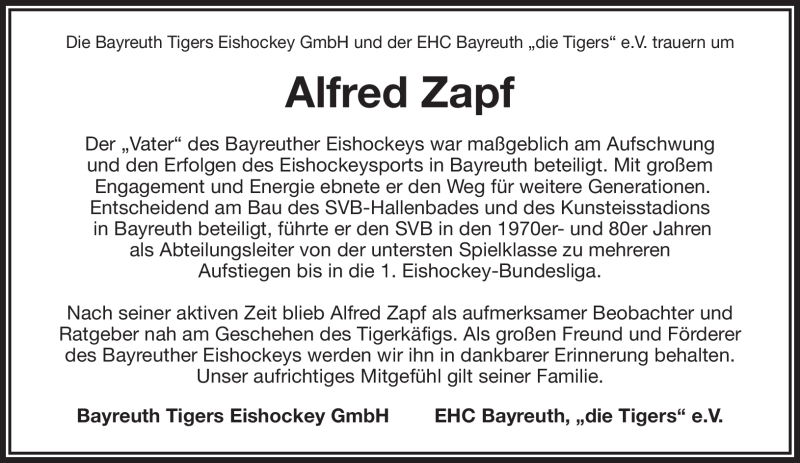 Hier finden Sie alle Traueranzeigen aus der Zeitung, die bisher für Alfred Zapf erschienen sind. Weitere Traueranzeigen, die in der Zeitung erscheinen, werden hier ebenfalls aufgelistet