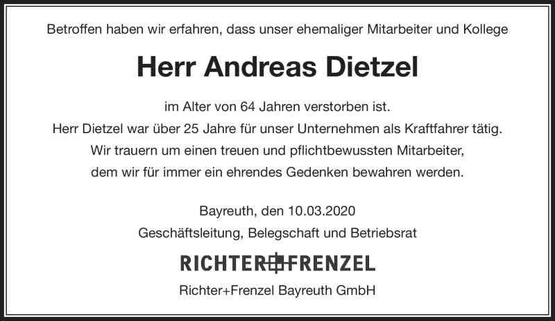 Hier finden Sie alle Traueranzeigen aus der Zeitung, die bisher für Andreas Dietzel erschienen sind. Weitere Traueranzeigen, die in der Zeitung erscheinen, werden hier ebenfalls aufgelistet