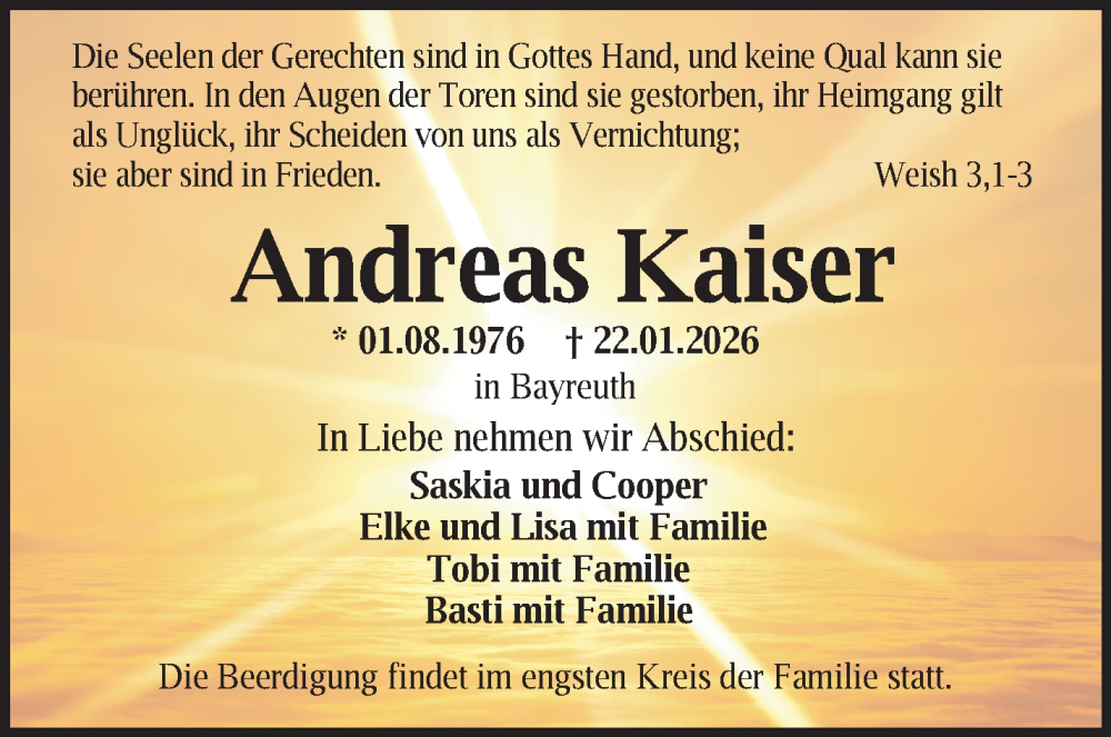 Hier finden Sie alle Traueranzeigen aus der Zeitung, die bisher für Andreas Kaiser erschienen sind. Weitere Traueranzeigen, die in der Zeitung erscheinen, werden hier ebenfalls aufgelistet
