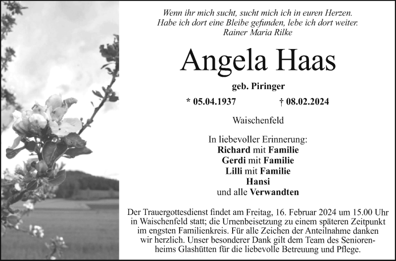Hier finden Sie alle Traueranzeigen aus der Zeitung, die bisher für Angela Haas erschienen sind. Weitere Traueranzeigen, die in der Zeitung erscheinen, werden hier ebenfalls aufgelistet