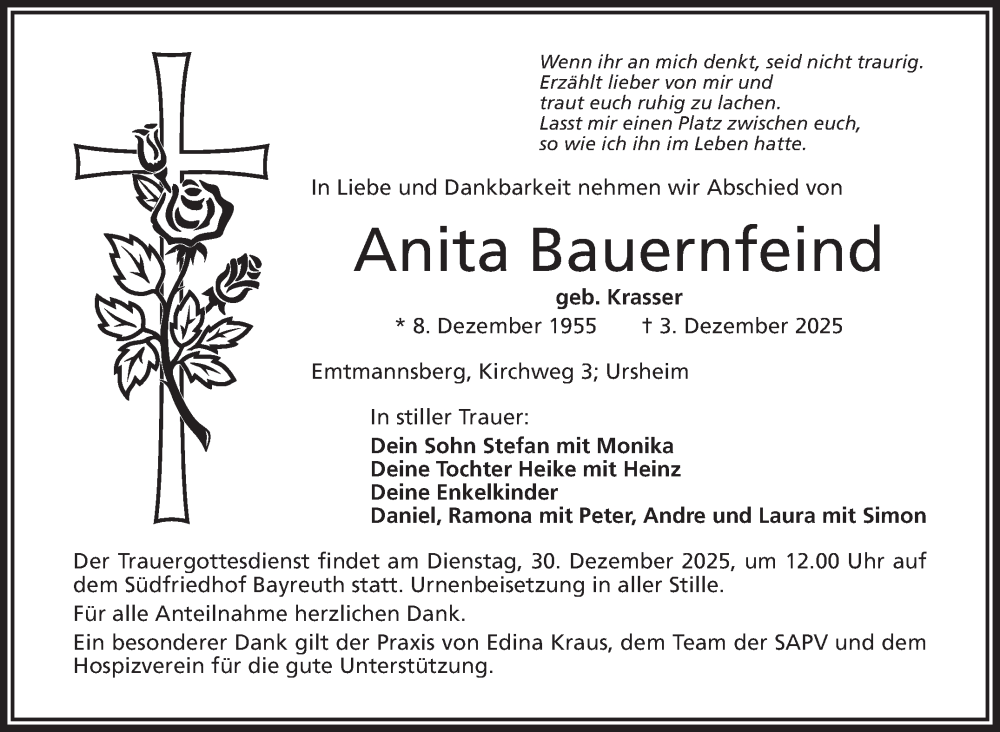 Hier finden Sie alle Traueranzeigen aus der Zeitung, die bisher für Anita Bauernfeind erschienen sind. Weitere Traueranzeigen, die in der Zeitung erscheinen, werden hier ebenfalls aufgelistet
