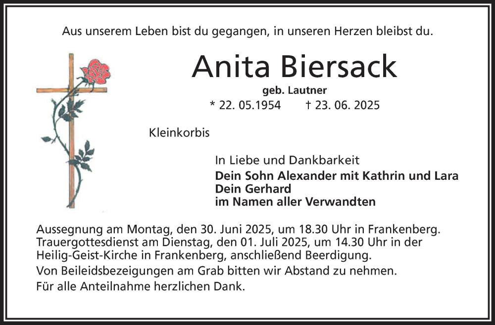 Hier finden Sie alle Traueranzeigen aus der Zeitung, die bisher für Anita Biersack erschienen sind. Weitere Traueranzeigen, die in der Zeitung erscheinen, werden hier ebenfalls aufgelistet