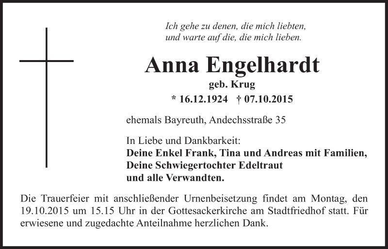 Hier finden Sie alle Traueranzeigen aus der Zeitung, die bisher für Anna Engelhardt erschienen sind. Weitere Traueranzeigen, die in der Zeitung erscheinen, werden hier ebenfalls aufgelistet