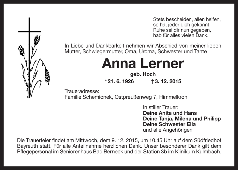 Hier finden Sie alle Traueranzeigen aus der Zeitung, die bisher für Anna Lerner erschienen sind. Weitere Traueranzeigen, die in der Zeitung erscheinen, werden hier ebenfalls aufgelistet
