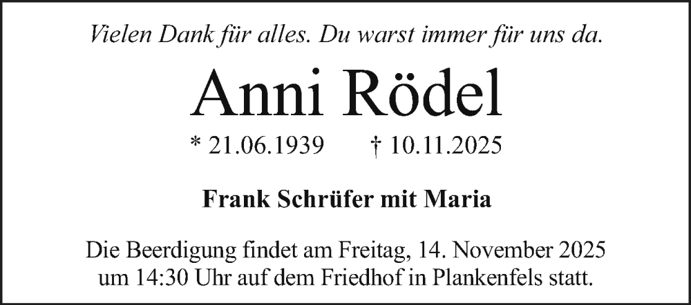 Hier finden Sie alle Traueranzeigen aus der Zeitung, die bisher für Anni Rödel erschienen sind. Weitere Traueranzeigen, die in der Zeitung erscheinen, werden hier ebenfalls aufgelistet