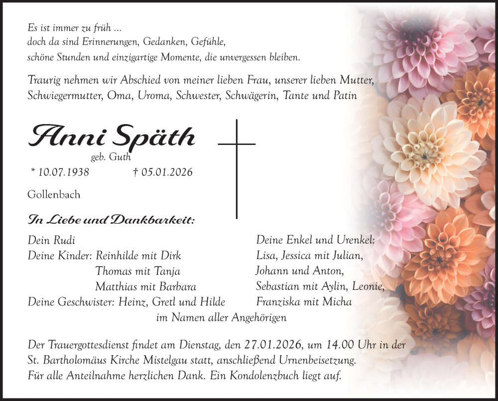 Hier finden Sie alle Traueranzeigen aus der Zeitung, die bisher für Anni Späth erschienen sind. Weitere Traueranzeigen, die in der Zeitung erscheinen, werden hier ebenfalls aufgelistet
