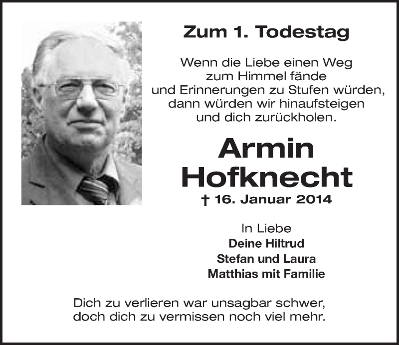 Hier finden Sie alle Traueranzeigen aus der Zeitung, die bisher für Armin Hofknecht erschienen sind. Weitere Traueranzeigen, die in der Zeitung erscheinen, werden hier ebenfalls aufgelistet