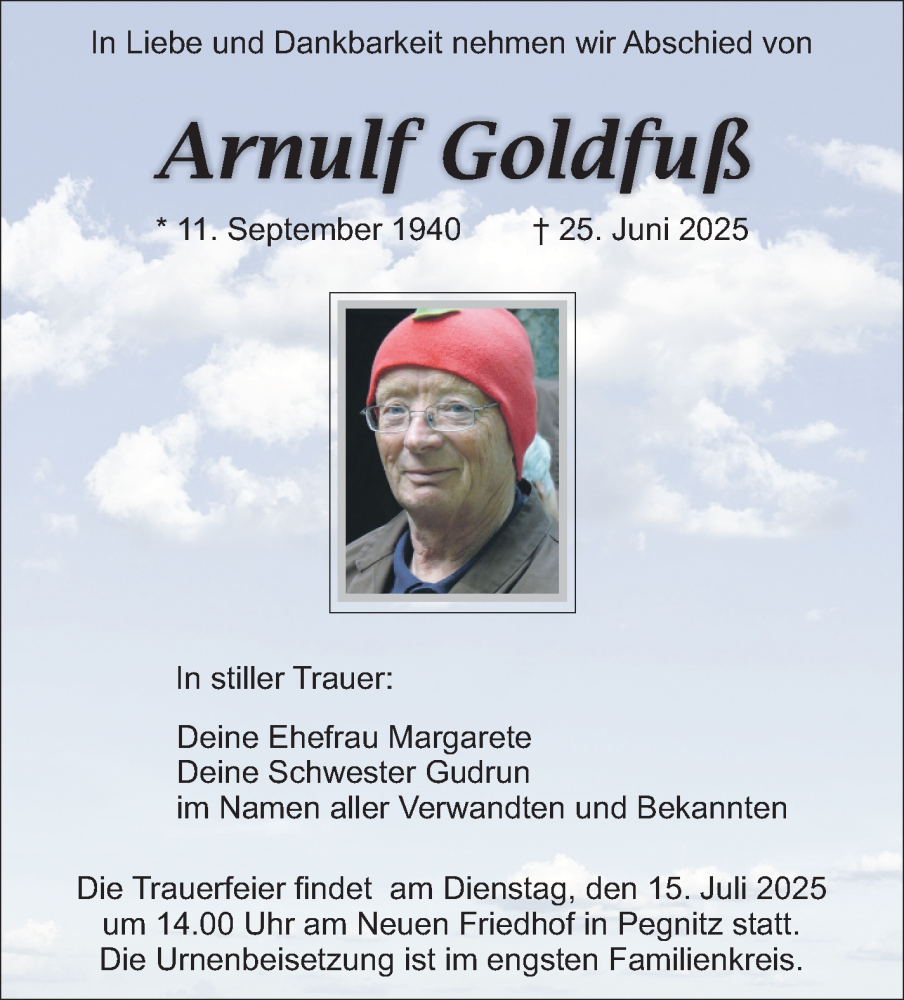 Hier finden Sie alle Traueranzeigen aus der Zeitung, die bisher für Arnulf Goldfuß erschienen sind. Weitere Traueranzeigen, die in der Zeitung erscheinen, werden hier ebenfalls aufgelistet