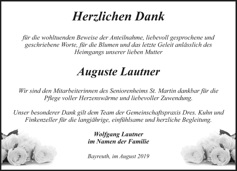 Hier finden Sie alle Traueranzeigen aus der Zeitung, die bisher für Auguste Lautner erschienen sind. Weitere Traueranzeigen, die in der Zeitung erscheinen, werden hier ebenfalls aufgelistet