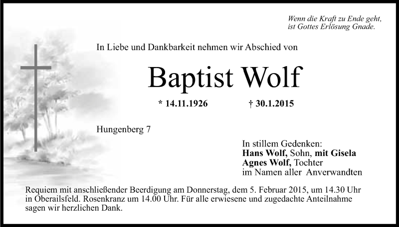 Hier finden Sie alle Traueranzeigen aus der Zeitung, die bisher für Baptist Wolf erschienen sind. Weitere Traueranzeigen, die in der Zeitung erscheinen, werden hier ebenfalls aufgelistet