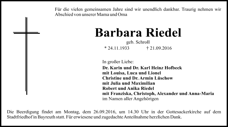 Hier finden Sie alle Traueranzeigen aus der Zeitung, die bisher für Barbara Riedel erschienen sind. Weitere Traueranzeigen, die in der Zeitung erscheinen, werden hier ebenfalls aufgelistet