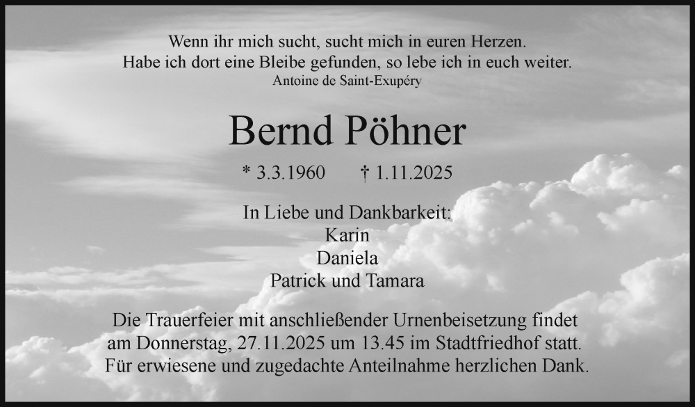 Hier finden Sie alle Traueranzeigen aus der Zeitung, die bisher für Bernd Pöhner erschienen sind. Weitere Traueranzeigen, die in der Zeitung erscheinen, werden hier ebenfalls aufgelistet