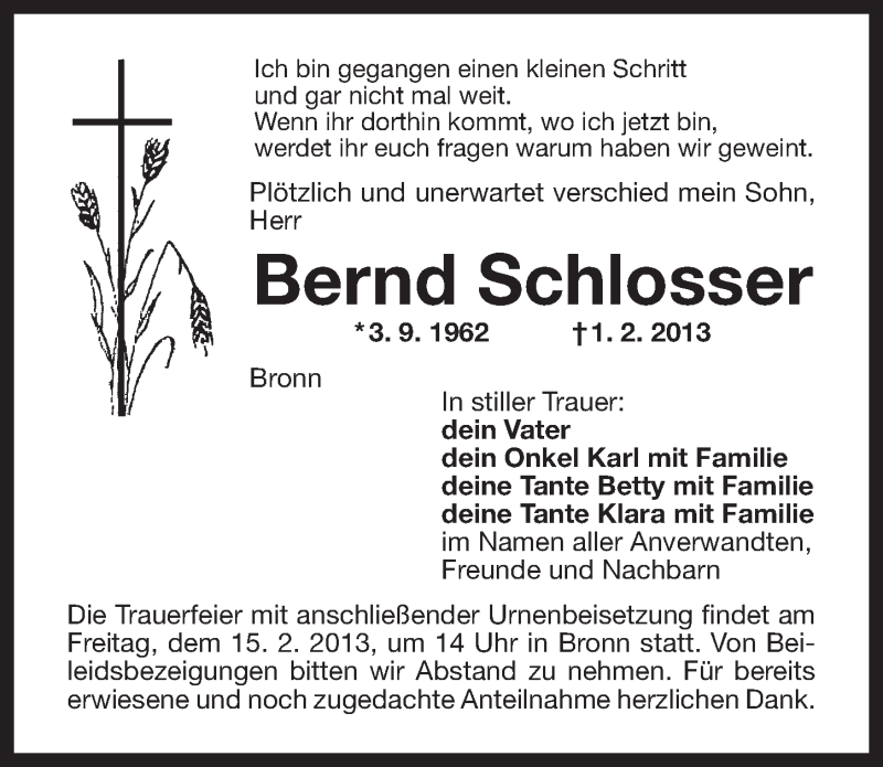 Hier finden Sie alle Traueranzeigen aus der Zeitung, die bisher für Bernd Schlosser erschienen sind. Weitere Traueranzeigen, die in der Zeitung erscheinen, werden hier ebenfalls aufgelistet