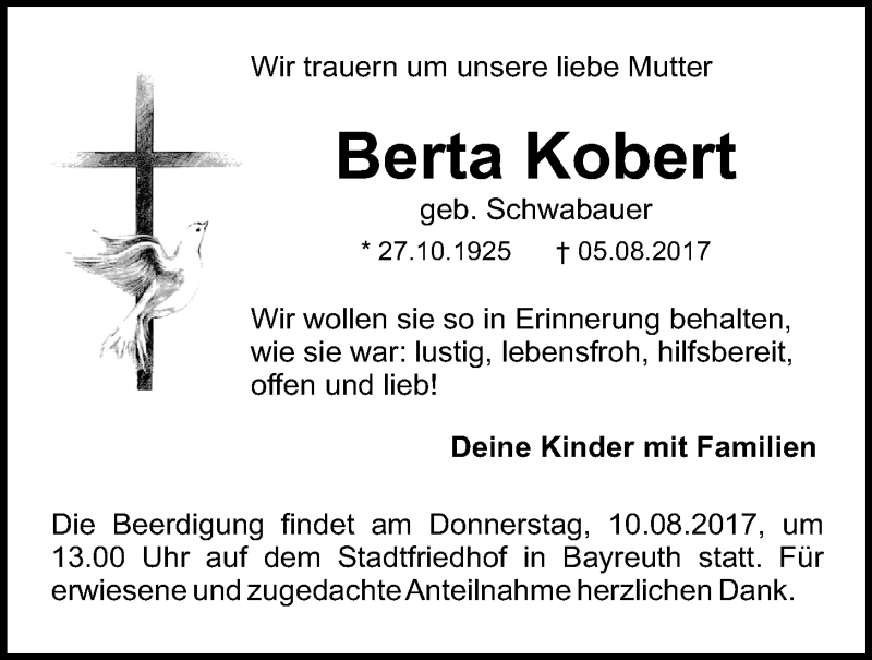 Hier finden Sie alle Traueranzeigen aus der Zeitung, die bisher für Berta Kobert erschienen sind. Weitere Traueranzeigen, die in der Zeitung erscheinen, werden hier ebenfalls aufgelistet
