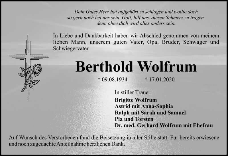 Hier finden Sie alle Traueranzeigen aus der Zeitung, die bisher für Berthold Wolfrum erschienen sind. Weitere Traueranzeigen, die in der Zeitung erscheinen, werden hier ebenfalls aufgelistet
