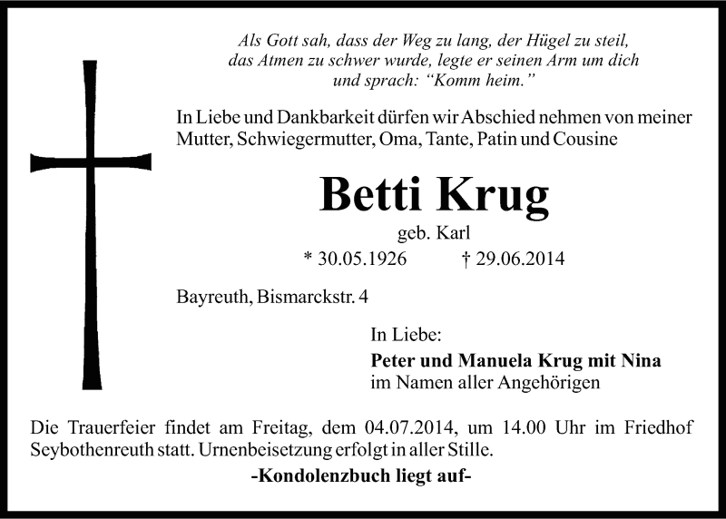 Hier finden Sie alle Traueranzeigen aus der Zeitung, die bisher für Betti Krug erschienen sind. Weitere Traueranzeigen, die in der Zeitung erscheinen, werden hier ebenfalls aufgelistet