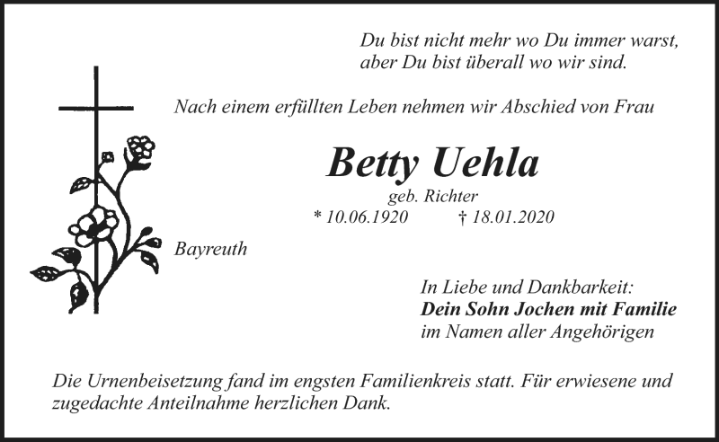 Hier finden Sie alle Traueranzeigen aus der Zeitung, die bisher für Betty Uehla erschienen sind. Weitere Traueranzeigen, die in der Zeitung erscheinen, werden hier ebenfalls aufgelistet