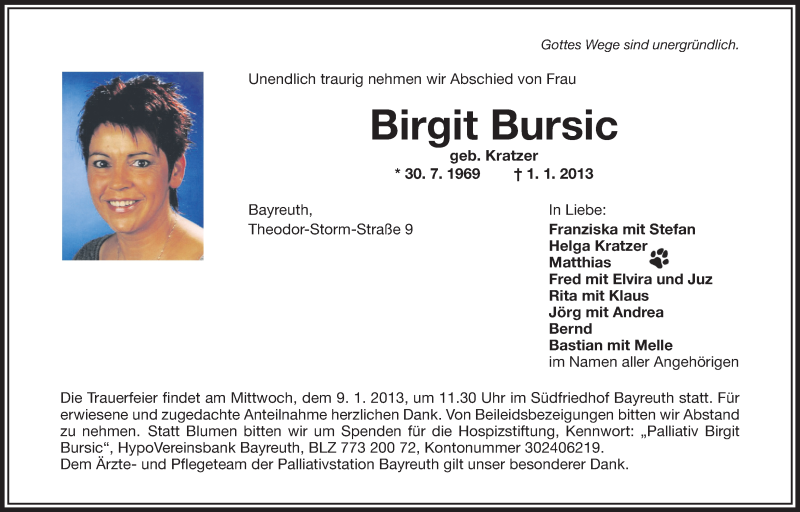 Hier finden Sie alle Traueranzeigen aus der Zeitung, die bisher für Birgit Bursic erschienen sind. Weitere Traueranzeigen, die in der Zeitung erscheinen, werden hier ebenfalls aufgelistet