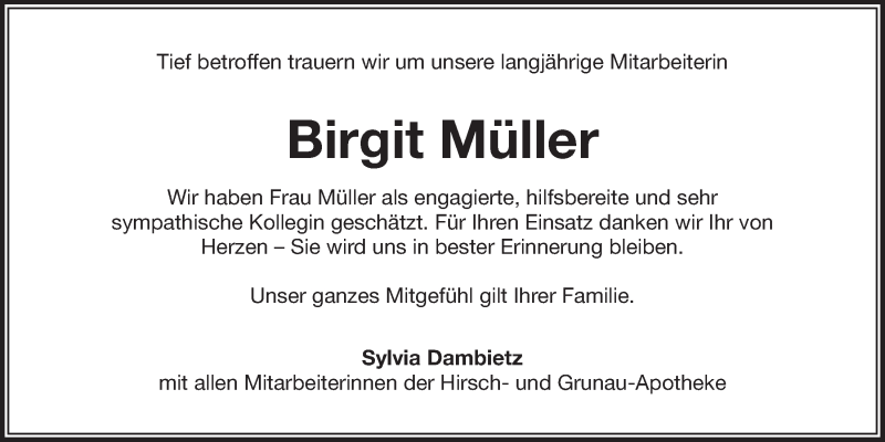 Hier finden Sie alle Traueranzeigen aus der Zeitung, die bisher für Birgit Müller erschienen sind. Weitere Traueranzeigen, die in der Zeitung erscheinen, werden hier ebenfalls aufgelistet