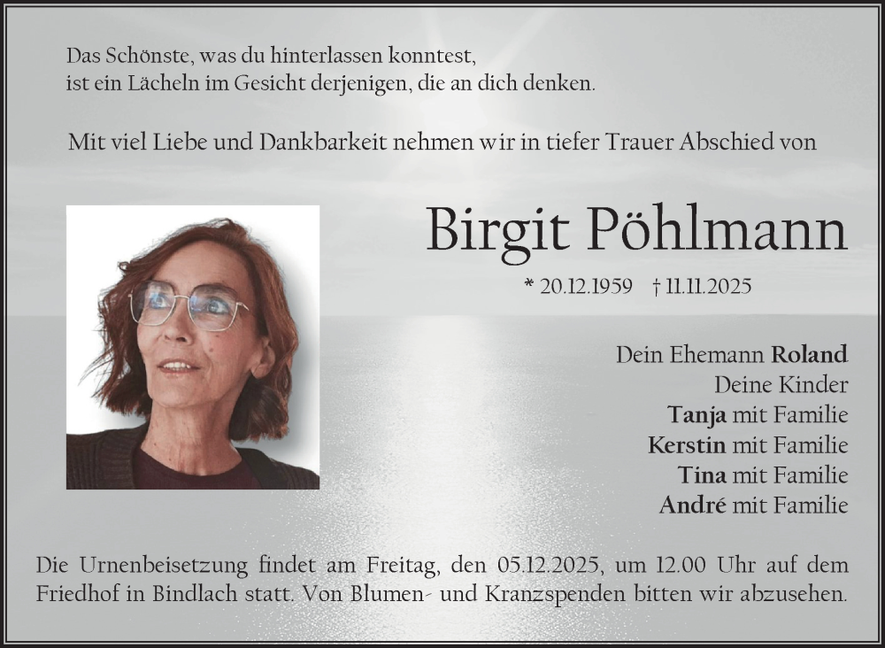 Hier finden Sie alle Traueranzeigen aus der Zeitung, die bisher für Birgit Pöhlmann erschienen sind. Weitere Traueranzeigen, die in der Zeitung erscheinen, werden hier ebenfalls aufgelistet