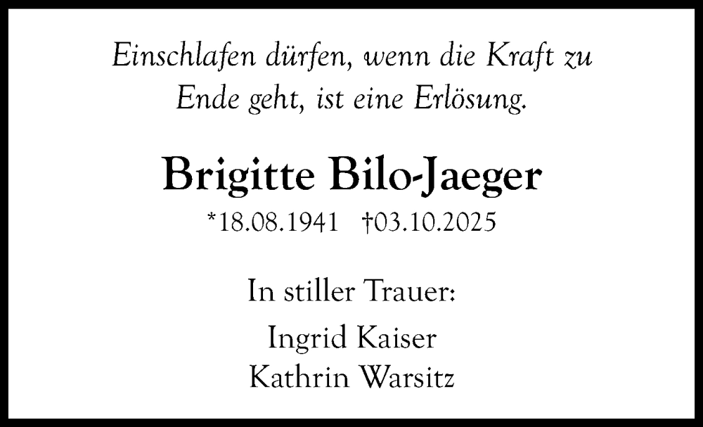 Hier finden Sie alle Traueranzeigen aus der Zeitung, die bisher für Brigitte Bilo-Jäger erschienen sind. Weitere Traueranzeigen, die in der Zeitung erscheinen, werden hier ebenfalls aufgelistet