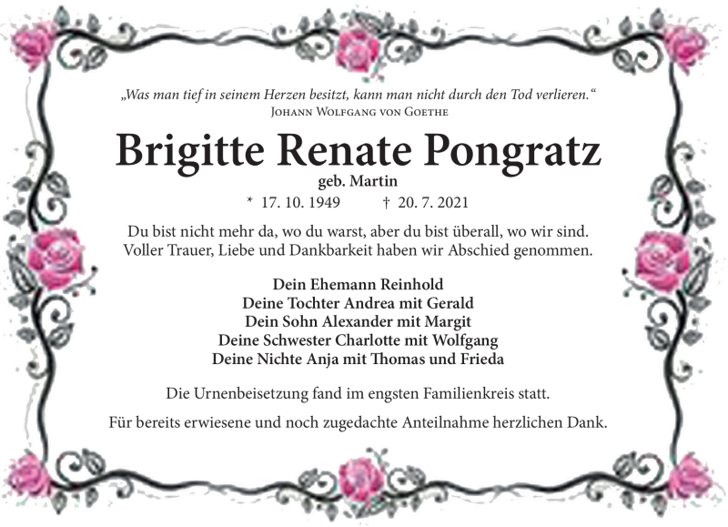 Hier finden Sie alle Traueranzeigen aus der Zeitung, die bisher für Brigitte Pongratz erschienen sind. Weitere Traueranzeigen, die in der Zeitung erscheinen, werden hier ebenfalls aufgelistet