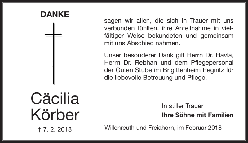 Hier finden Sie alle Traueranzeigen aus der Zeitung, die bisher für Cäcilia Körber erschienen sind. Weitere Traueranzeigen, die in der Zeitung erscheinen, werden hier ebenfalls aufgelistet