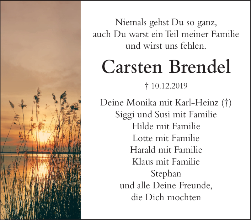 Hier finden Sie alle Traueranzeigen aus der Zeitung, die bisher für Carsten Brendel erschienen sind. Weitere Traueranzeigen, die in der Zeitung erscheinen, werden hier ebenfalls aufgelistet