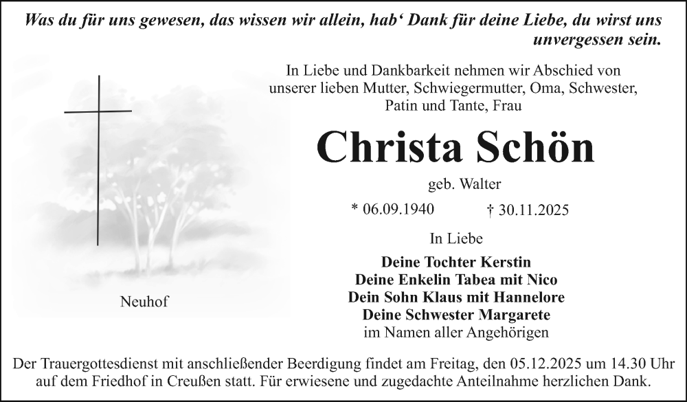 Hier finden Sie alle Traueranzeigen aus der Zeitung, die bisher für Christa Schön erschienen sind. Weitere Traueranzeigen, die in der Zeitung erscheinen, werden hier ebenfalls aufgelistet