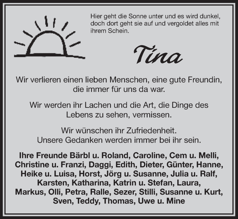 Hier finden Sie alle Traueranzeigen aus der Zeitung, die bisher für Christina Abend erschienen sind. Weitere Traueranzeigen, die in der Zeitung erscheinen, werden hier ebenfalls aufgelistet