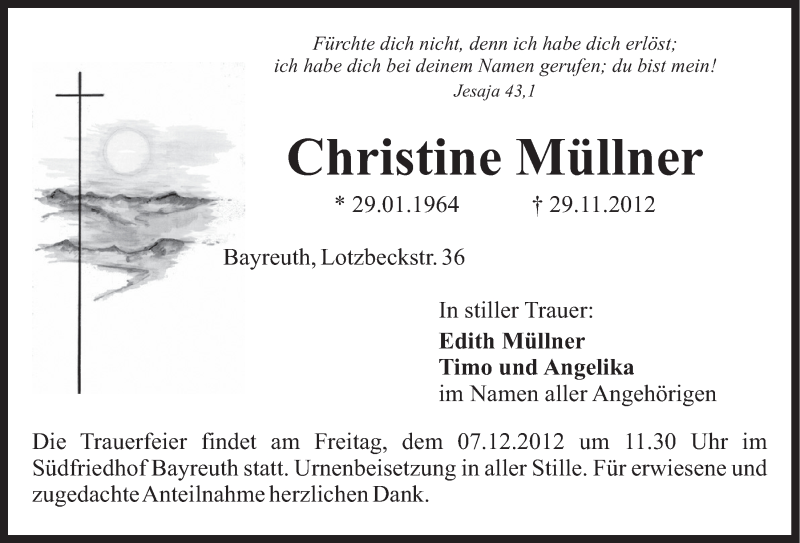 Hier finden Sie alle Traueranzeigen aus der Zeitung, die bisher für Christine Müllner erschienen sind. Weitere Traueranzeigen, die in der Zeitung erscheinen, werden hier ebenfalls aufgelistet
