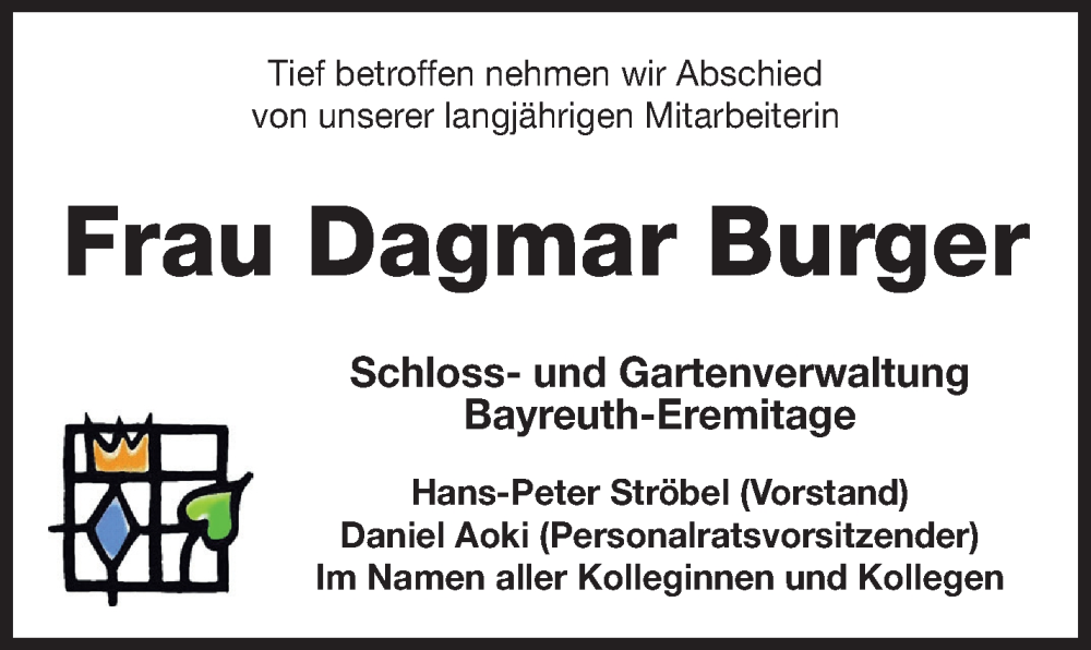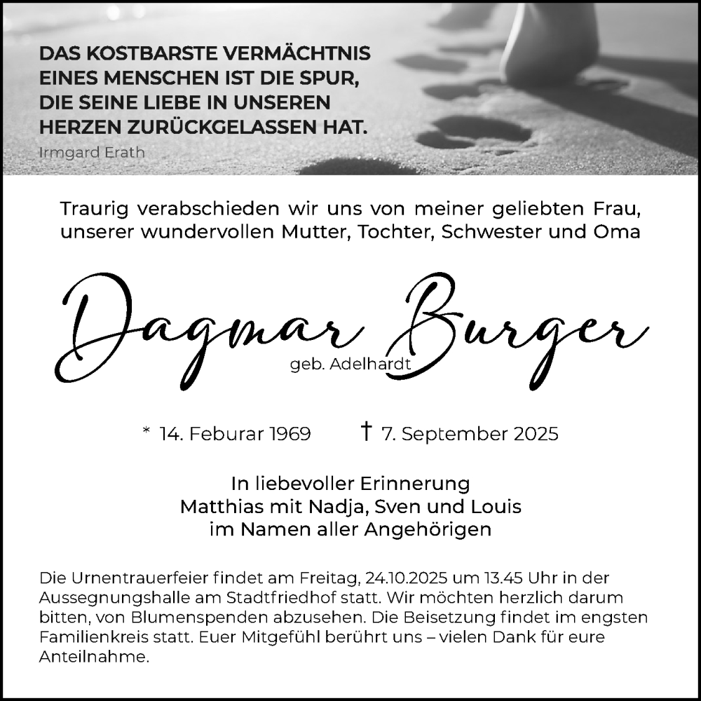 Hier finden Sie alle Traueranzeigen aus der Zeitung, die bisher für Dagmar Burger erschienen sind. Weitere Traueranzeigen, die in der Zeitung erscheinen, werden hier ebenfalls aufgelistet