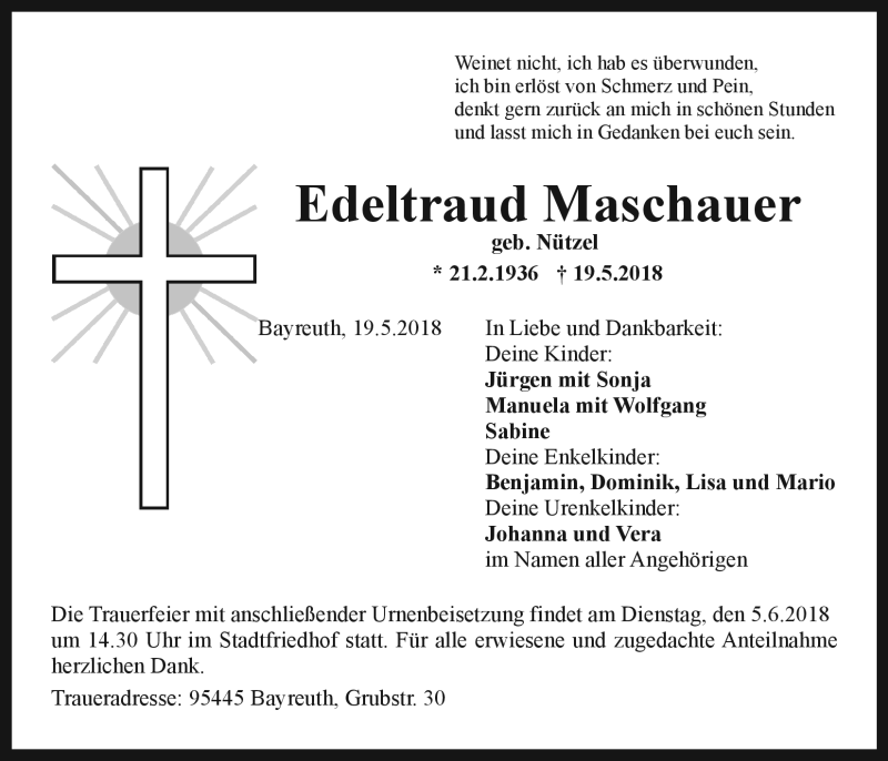 Hier finden Sie alle Traueranzeigen aus der Zeitung, die bisher für Edeltraud Maschauer erschienen sind. Weitere Traueranzeigen, die in der Zeitung erscheinen, werden hier ebenfalls aufgelistet