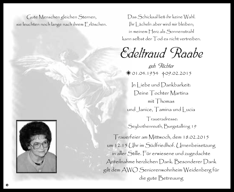 Hier finden Sie alle Traueranzeigen aus der Zeitung, die bisher für Edeltraud Raabe erschienen sind. Weitere Traueranzeigen, die in der Zeitung erscheinen, werden hier ebenfalls aufgelistet