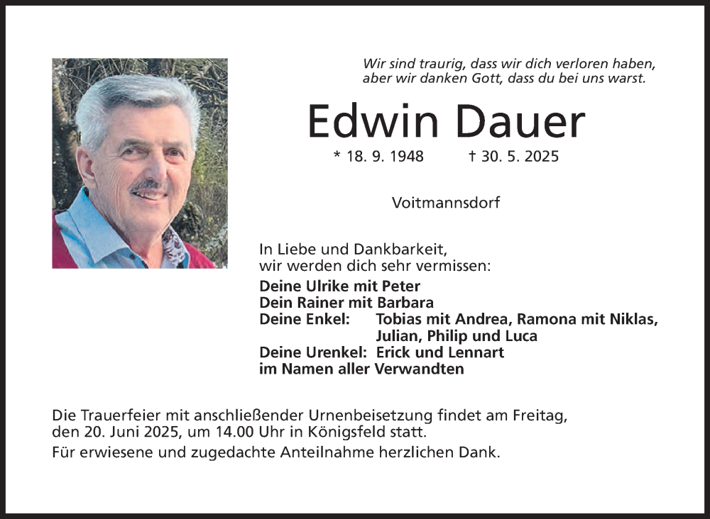 Hier finden Sie alle Traueranzeigen aus der Zeitung, die bisher für Edwin Dauer erschienen sind. Weitere Traueranzeigen, die in der Zeitung erscheinen, werden hier ebenfalls aufgelistet