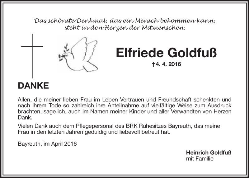 Hier finden Sie alle Traueranzeigen aus der Zeitung, die bisher für Elfriede Goldfuß erschienen sind. Weitere Traueranzeigen, die in der Zeitung erscheinen, werden hier ebenfalls aufgelistet