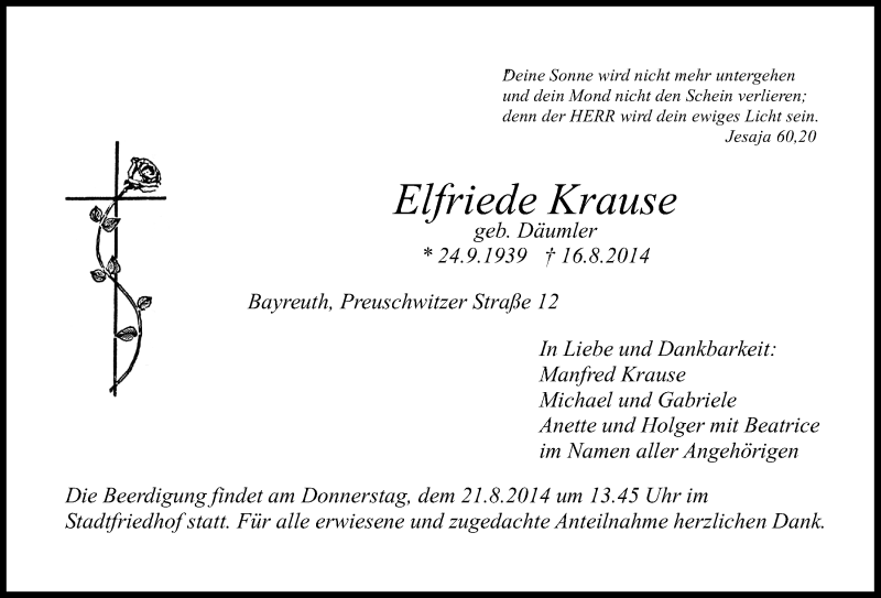 Hier finden Sie alle Traueranzeigen aus der Zeitung, die bisher für Elfriede Krause erschienen sind. Weitere Traueranzeigen, die in der Zeitung erscheinen, werden hier ebenfalls aufgelistet