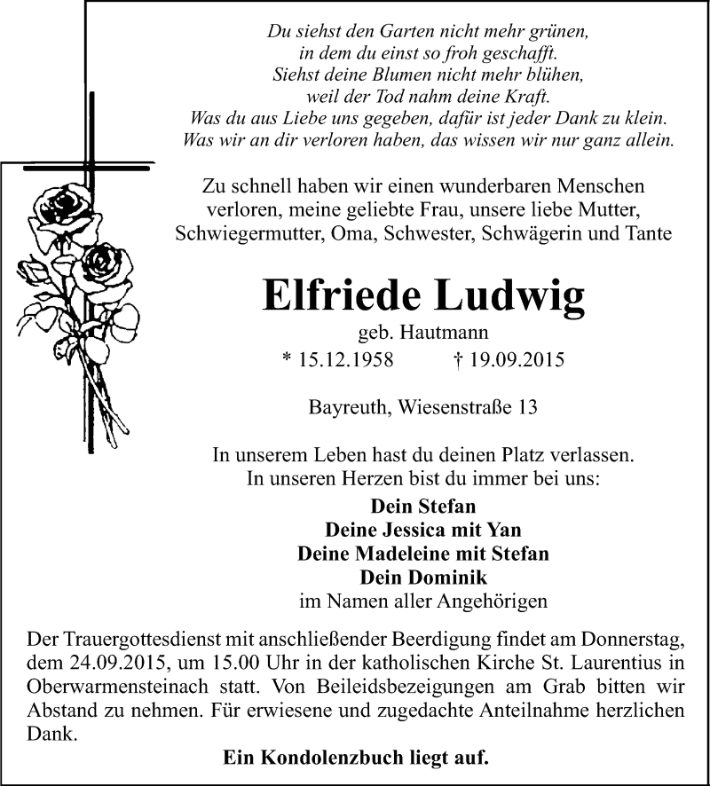 Hier finden Sie alle Traueranzeigen aus der Zeitung, die bisher für Elfriede Ludwig erschienen sind. Weitere Traueranzeigen, die in der Zeitung erscheinen, werden hier ebenfalls aufgelistet