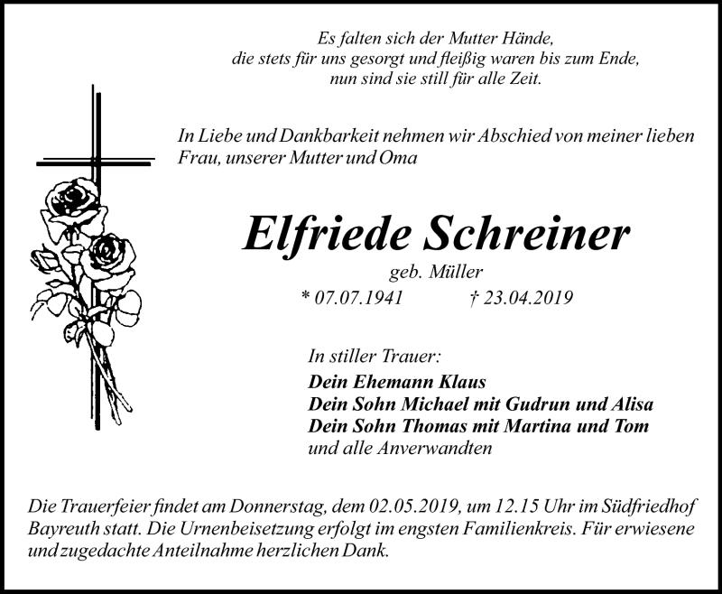 Hier finden Sie alle Traueranzeigen aus der Zeitung, die bisher für Elfriede Schreiner erschienen sind. Weitere Traueranzeigen, die in der Zeitung erscheinen, werden hier ebenfalls aufgelistet
