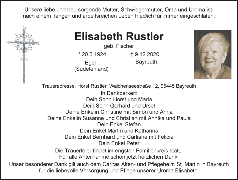 Hier finden Sie alle Traueranzeigen aus der Zeitung, die bisher für Elisabeth Rustler erschienen sind. Weitere Traueranzeigen, die in der Zeitung erscheinen, werden hier ebenfalls aufgelistet